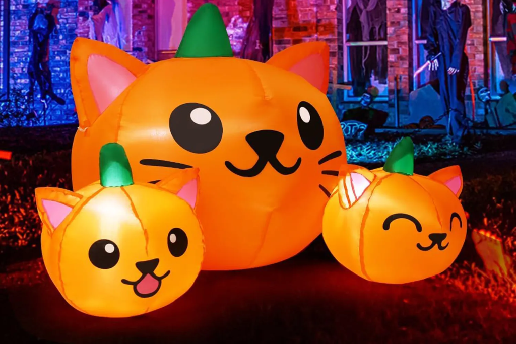 Want something fun and family-friendly? The Comin Pumpkin Cat Inflatable is a delightful choice. Featuring three smiling pumpkin cats stacked together, this inflatable balances spooky and cute perfectly.