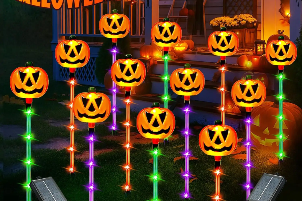 If you’re after sustainable and festive décor, the Sanjicha Solar Pumpkin Lights are perfect. These solar-powered stakes feature pumpkin-shaped lanterns that charge during the day and light up automatically at night.