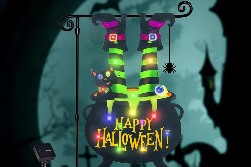 If you’re short on space but still want festive touches, a lighted garden flag is a smart option. This piece features bold Halloween imagery paired with LED lights that make it stand out after dark.